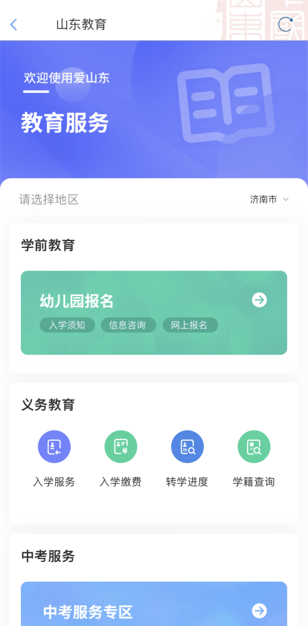 “山东教育”面向全省学生及家长提供入学报名、学籍查询、成绩查询、录取查询等高频服务,推动教育相关事项办理不排队、无证明、零跑腿。目前“山东教育”服务旗舰店已基本实现学前教育、义务教育、中考、学考、高考、成人高等教育等各阶段教育服务全覆盖。