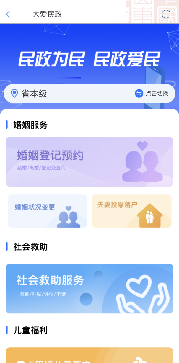 婚姻登记、社会救助、儿童福利、养老服务……“大爱民政”服务旗舰店一站解决你的服务需求,秉承“民政为民、民政爱民”理念,实现婚姻登记预约跨省通办、保障福利申领掌上即办、养老机构服务指尖即查,还可一键直达老年关怀模式与助残专区。