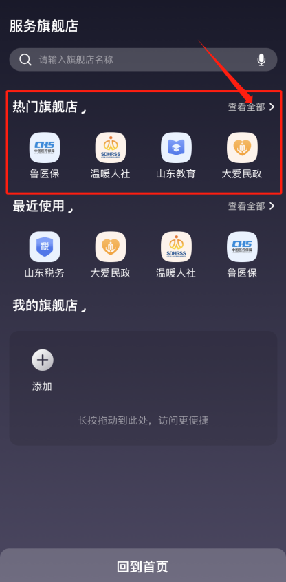 用户只需进入“爱山东”APP、支付宝、微信小程序,首页下滑松手进入“服务旗舰店”,点击“热门旗舰店-查看全部”,即可根据需要选择旗舰店办理相关服务。