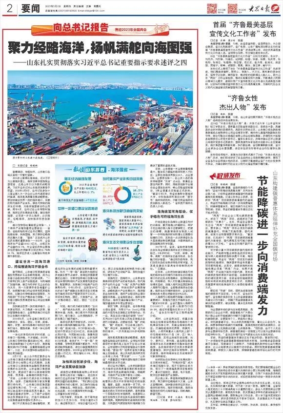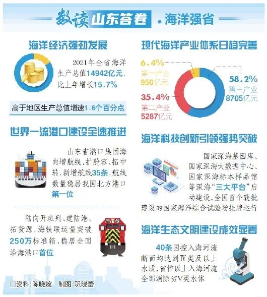 春节期间,山东港口贸易集团首笔塞拉利昂铁矿石业务顺利落地,成为山东港口各板块协同发力的新成果。“一方面我们向上游产业链挺进,与终端钢厂加强沟通,建立与非洲矿石企业的合作关系,另一方面携手青岛港董矿公司,协同提升港口作业效率和贸易服务质效,以融合优势畅通供应链服务,为内陆钢厂节日生产提供有力保障。”山东港口国际贸易集团青岛公司总经理秦书平说。 加快建设世界一流的海洋港口,山东谋定而动,大力推进一体化改革、建设智慧绿色港口,全面释放港口对经济社会发展的支撑作用。 2019年8月,山东省港口集团正式挂牌成立,青岛、烟台、日照、威海、潍坊、东营、滨州沿海港口告别过去的单打独斗,握指成拳,形成一体化协同发展格局。 一体化改革后的3年多时间里,山东港口一路快跑,大步超越。2022年,山东港口货物吞吐量突破16亿吨,成立以来连续跨越4个亿吨大台阶,集装箱量突破3700万标箱,总量继续稳居全球第一、三位,东北亚国际航运枢纽中心地位更加稳固。 2月17日,由上合示范区管委会与山东港口集团共同建设的青岛国际能源交易中心有限公司正式揭牌,这是山东港口从装卸港向金融贸易港转型发展的长远布局。山东省港口集团组建之初,便启动了港口从装卸港向物流港、贸易港、金融港的转型升级。“目前,山东港口已逐步在大宗商品交易、结算、交割物流等方面发挥重要引领作用。”山东港口投控集团副总经理张亮介绍,下一步,山东港口将以油品等大宗商品贸易为重点,加快建设覆盖多货种、上下游产业链的综合贸易服务平台,打造大宗商品东北亚集散基地和国际交易中心。 港口不仅是综合交通运输枢纽,更是经济社会发展的战略资源和重要支撑。作为“一带一路”新亚欧大陆桥经济走廊主要节点城市、鲁南经济圈最便捷的出海口,日照市坚持港口发展与城市总体规划和相关产业发展规划紧密衔接、配套联动,发挥港口对临港产业的集聚作用。今年2月6日,总投资387亿元的48个港产城融合发展项目在日照港举行建成项目投产暨新项目开工仪式。项目涉及物流、园区、文旅等产业,进一步推动港区、城区、园区“三区互融”。 对陆,港口成为城市发展的“合伙人”,港产城共生共荣,步入高质量发展快车道;向海,港口是对外开放的重要门户,借力港口,山东拥抱海洋、开放发展之门越开越大。 海洋经济是开放型经济。2022年,山东港口海向新增航线37条,其中“一带一路”航线13条、RCEP航线14条,拉动外贸进出口近200亿元,航线总数达到327条,外贸航线233条,数量和密度稳居我国北方港口首位。山东抢抓RCEP机遇,有效扩大“一带一路”市场规模,货物贸易规模不断跃升,外贸新动能持续激活,进出口稳固提质良好态势更加显现。2022年全省货物进出口总值3.3万亿元,同比增长13.8%,再创历史新高。 二、加快科技创新步伐,海洋产业发展动能强劲 威海世纪博康海藻有限公司车间里,海带从流水线一端输入,走出流水线时已经全然没有了原本的模样,成为高附加值的活性原料。“我们再以这些活性原料为核心配料,加工制作功能食品、保健食品、特医食品、海洋药物、化妆品等,充分挖掘海带的附加值。”公司董事长郝守祝说。 1吨干海带,用盐渍、烘干等传统初加工工艺加工后,市场价值约4万元;通过精深加工,市场价值可达43万元;再以这些海藻活性物质为核心配料,研发生产出功能产品,其附加值又可以提升10倍。 依海而立,因海而兴,山东具有发展海洋科技和产业的有利条件。现代海洋产业作为全省“十强”优势产业集群之一全力推进,传统优势产业提质增效,战略性新兴产业发展壮大,海洋服务业加快发展,海洋产业链迈向全国价值链中高端。全省海洋渔业、海洋生物医药业、海洋交通运输业等6个产业,增加值连续多年居全国首位。 钢花飞舞,流光溢彩,在中集来福士烟台基地,为荷兰Van Oord公司建造的大型风电安装船正在焊接作业。另一边,其自主设计建造的首艘“3060”系列2200T自升式海上风电安装船正在进行分段建造。这艘有四条“腿”的轮船,“腿”收起来,可以在海上航行;“腿”伸出来,能稳稳地“站”在70米深的海中,一次吊装起2200多吨钢铁结构。 海洋是高质量发展战略要地,是高端装备制造业的竞技场。全球钻井深度最深的半潜式海上钻井平台在山东诞生,全球首艘10万吨级智慧渔业大型养殖工船“国信1号”培养的首批大黄鱼端上百姓餐桌,海上风电机组并网实现山东海上风电“零突破”……“山东造”大国重器正不断向国际海洋工程领域最高科技水平迈进。 牢记总书记嘱托,山东把创新驱动作为海洋经济高质量发展的根本驱动力,海洋科技由跟跑向并跑、领跑跨越,为海洋产业发展不断注入动能。 打开手机App“西太观测网”,就能看到从西太平洋深海传回的现场数据,温度、盐度、流速等一目了然。中科院海洋研究所所长王凡带领科研团队建成的西太平洋科学观测网,是我国第一个深海实时科学观测网,也是国际上首次实现西太平洋主流系连续实时潜标组网观测。观测网获取的连续和实时数据,为我国的气候预报和环境保障工作提供了重要的基础支撑。 目前,山东拥有一支全国数量规模最大、整体实力最强的海洋科技人才队伍:全职住鲁海洋界院士20人,占全国33%,全国排名第一;在山东入选的海洋领域国家“杰青”