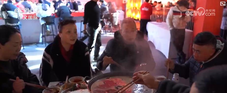 夜幕降临,广场上搭建起了1000平方米的火锅宴会场,顾客围坐锅边,看表演聊家常。