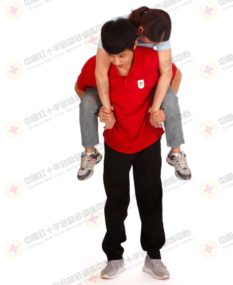 (1)救护员背向伤员蹲下,让伤员将双臂环抱于救护员胸前。