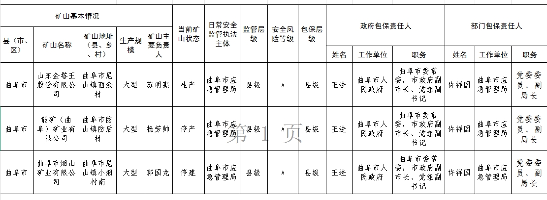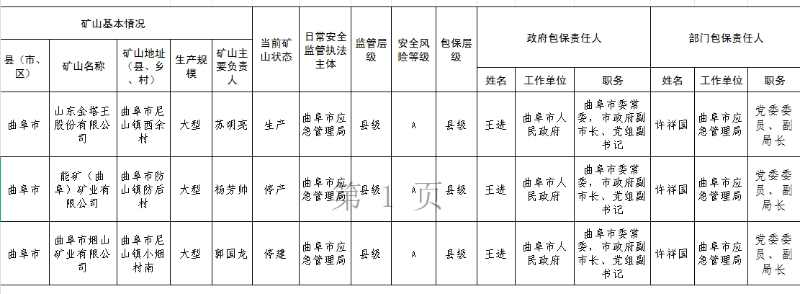 附件1:曲阜市辖区非煤矿山安全监管责任主体及联系包保人员名单