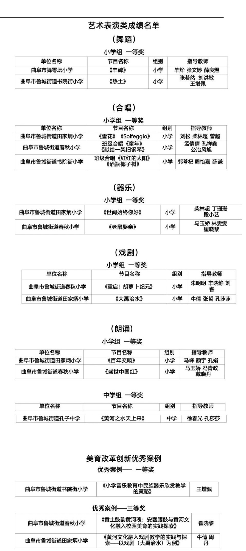 近日,济宁市教育局公布济宁市第十三届学校艺术节比赛获奖情况,曲阜市鲁城街道中心中学推送的表演类12个节目全部荣获一等奖,中小学美育改革创新优秀成果作品获一等奖1个,三等奖2个,获奖等次与数量均创历史新高,充分展示了鲁城街道美育教育的丰硕成果。